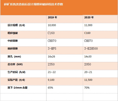 現(xiàn)在3臺(tái)破碎機(jī)同時(shí)開啟,系統(tǒng)能力達(dá)到1200t/h,75%-14mm,破破碎系統(tǒng)其它設(shè)備維持不變,篩網(wǎng)從改造前的16x26毫米變成現(xiàn)在的14x30毫米。在磨機(jī)不變的情況下,破磨系統(tǒng)能力達(dá)到11500噸/天,破碎系統(tǒng)滿足了磨礦能力的要求。
